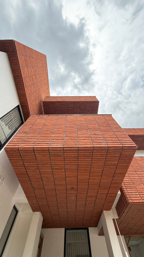 Materiality is characterized by terracotta or exposed brick slips with raked joints, producing a dense, textured surface in warm reddish-brown tones that contrasts with the smooth white walls. The stacked horizontal bond reinforces the building’s layered geometry, wrapping both vertical faces and soffits for a cohesive effect. On-site construction elements and tropical landscaping, including tall palm trees, highlight the climate-responsive design approach and the contrast between the building process and the finished architectural form.
