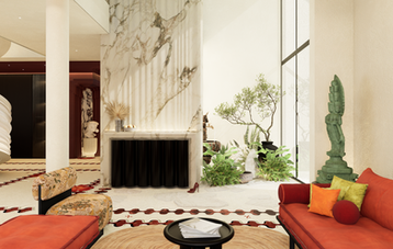 This residential interior is a spectacular showcase of Italian Contemporary Luxury, defined by its dramatic artistic gestures and opulent materiality. The space is anchored by an extraordinary sculptural spiral staircase, whose unique, flowing balustrade serves as a commanding focal point. The design is rich in high-end specifications, featuring expensive, rare marble used prominently on the kitchen counters and island. Further adding to the sensual texture of the space are the soft, possibly velvet ceilings (interpreted from the undulating, textured surfaces), which lend a sense of plush enclosure and superb acoustic quality.