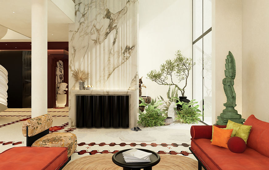 The aesthetic is heavily informed by choice Italian-designed furnishings, evident in the curvilinear, low-slung seating and the richly upholstered burgundy velvet dining chairs. Visual drama is intensified by the flooring, a textured surface featuring custom, organic deep red inlays that resemble fluid artistry, defining the open zones. This interior successfully merges artistic eccentricity with exceptional material quality and craftsmanship, establishing a visually captivating and sumptuously finished home.